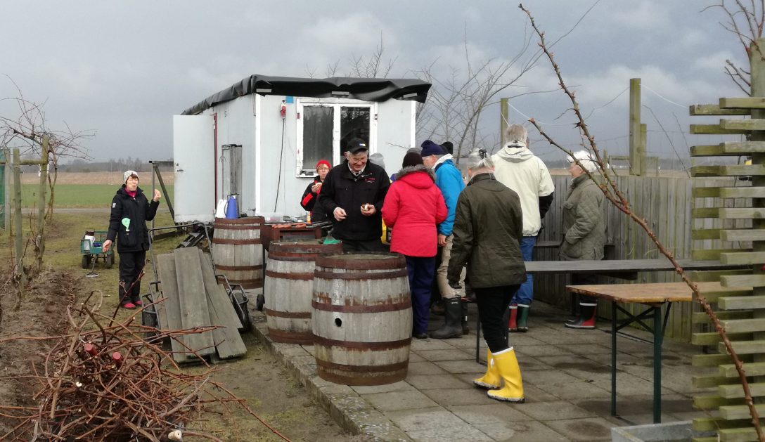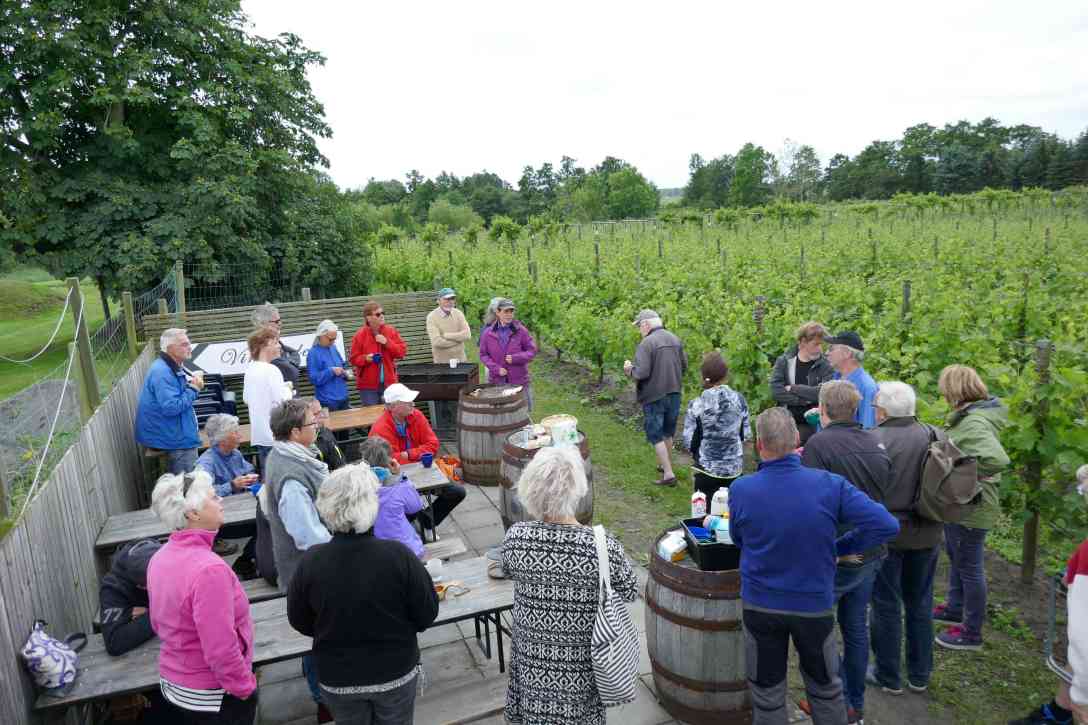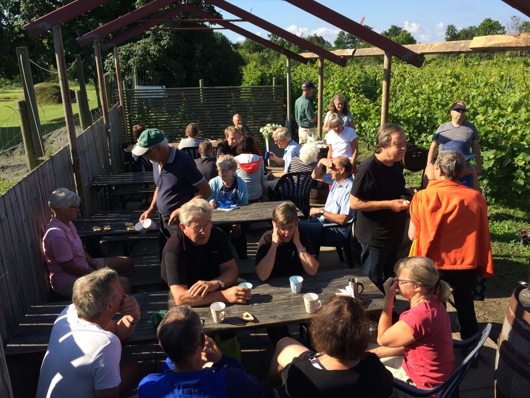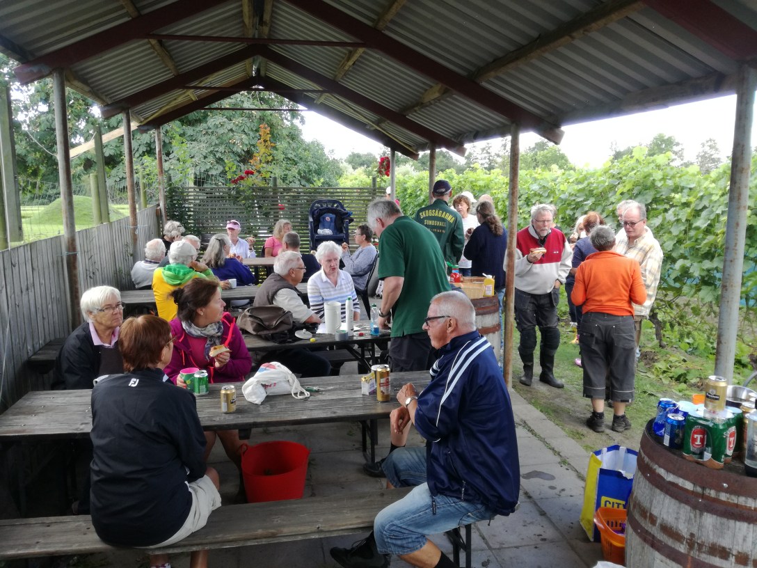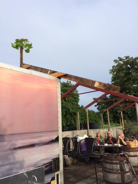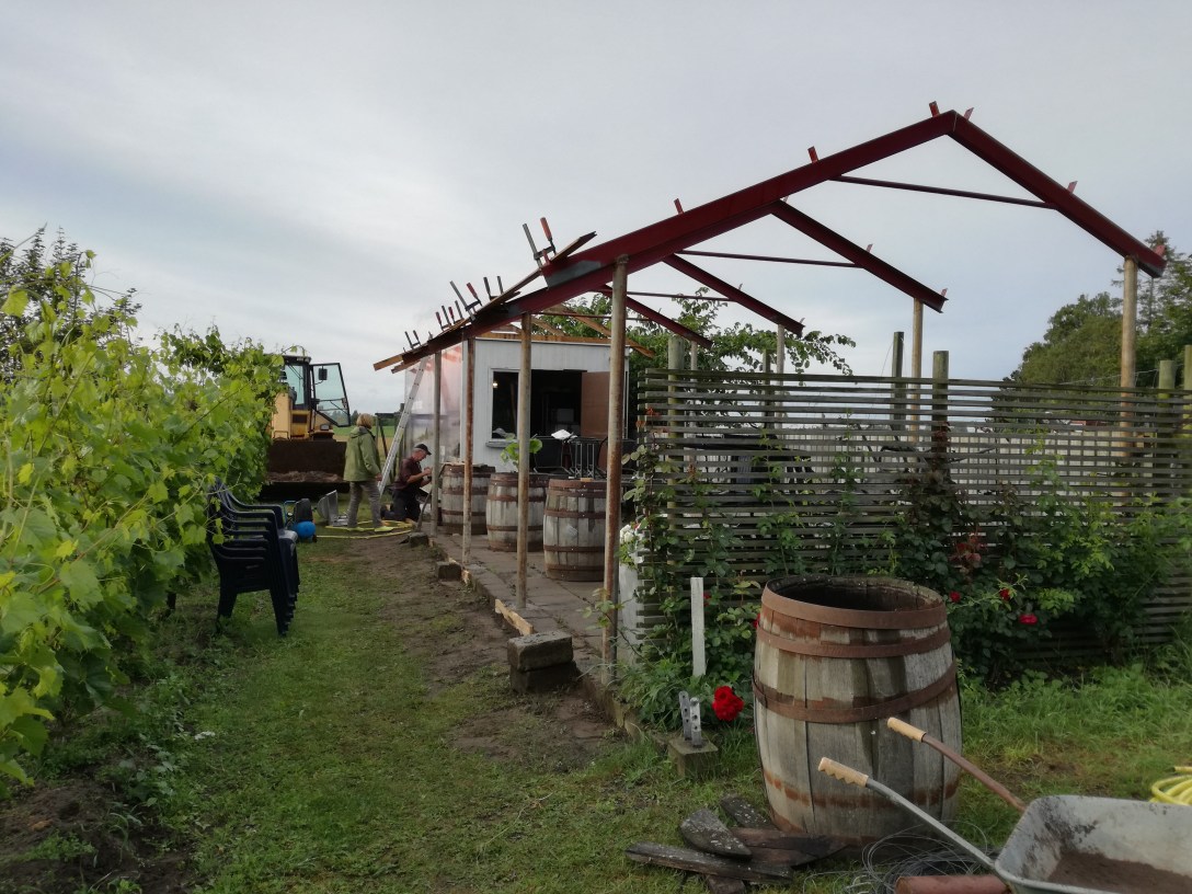 I förlängningen av arbetsboden ligger vår uteplats. Den nyttjar vi flitigt varje gång vingårdens abonnenter kommer. Här fikar vi och här äter vi lunch. Ibland steker solen, ibland vräker det ner med regn eller snö så vi har ofta saknat ett skydd över platsen.
