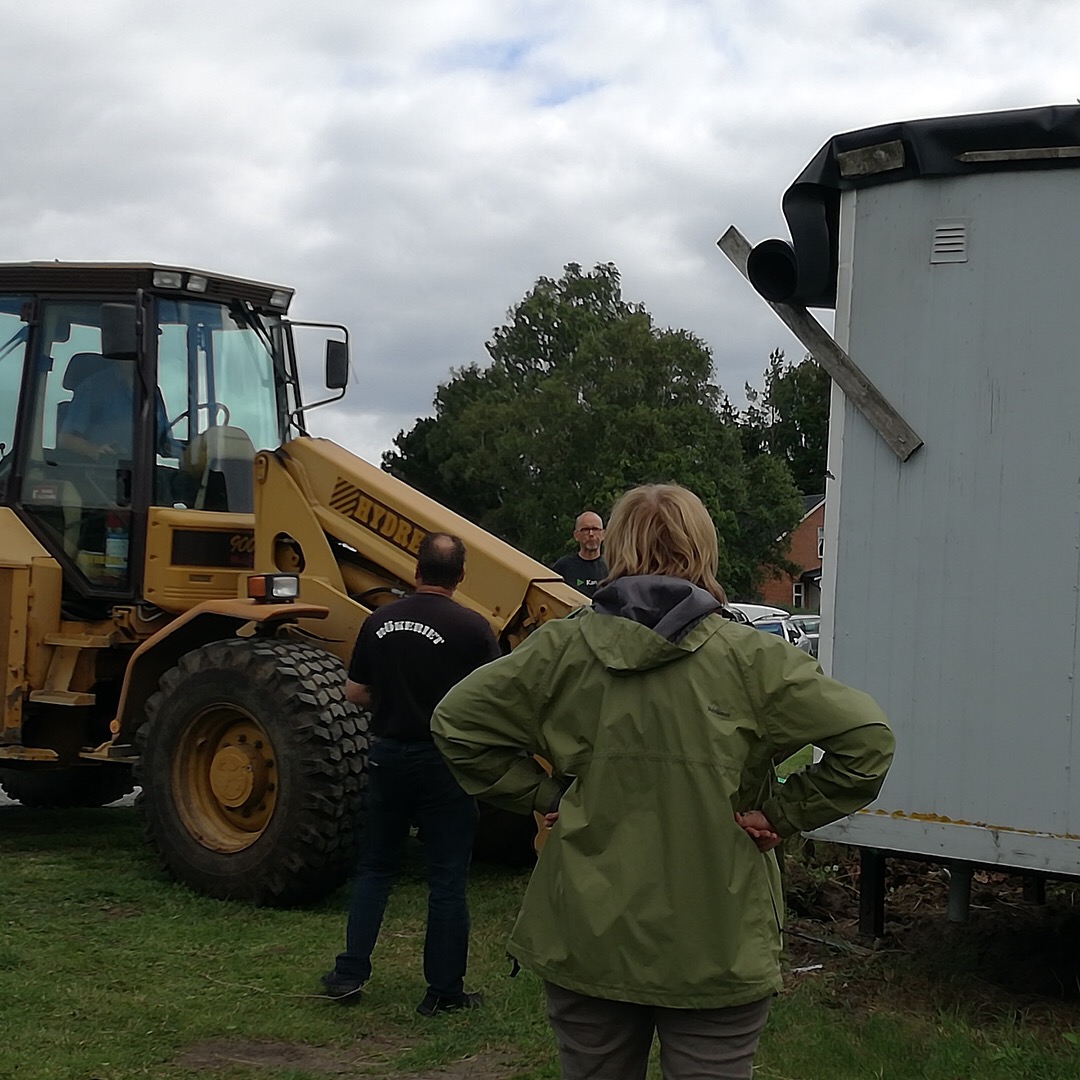 Med hjälp av frontlastaren, en vagn, kraftiga spännband, ett stort mått av envishet och precisionsarbete från förarens sida + kloka förslag från flera håll, lyckades det oss att lirka in den nya boden på sin plats.