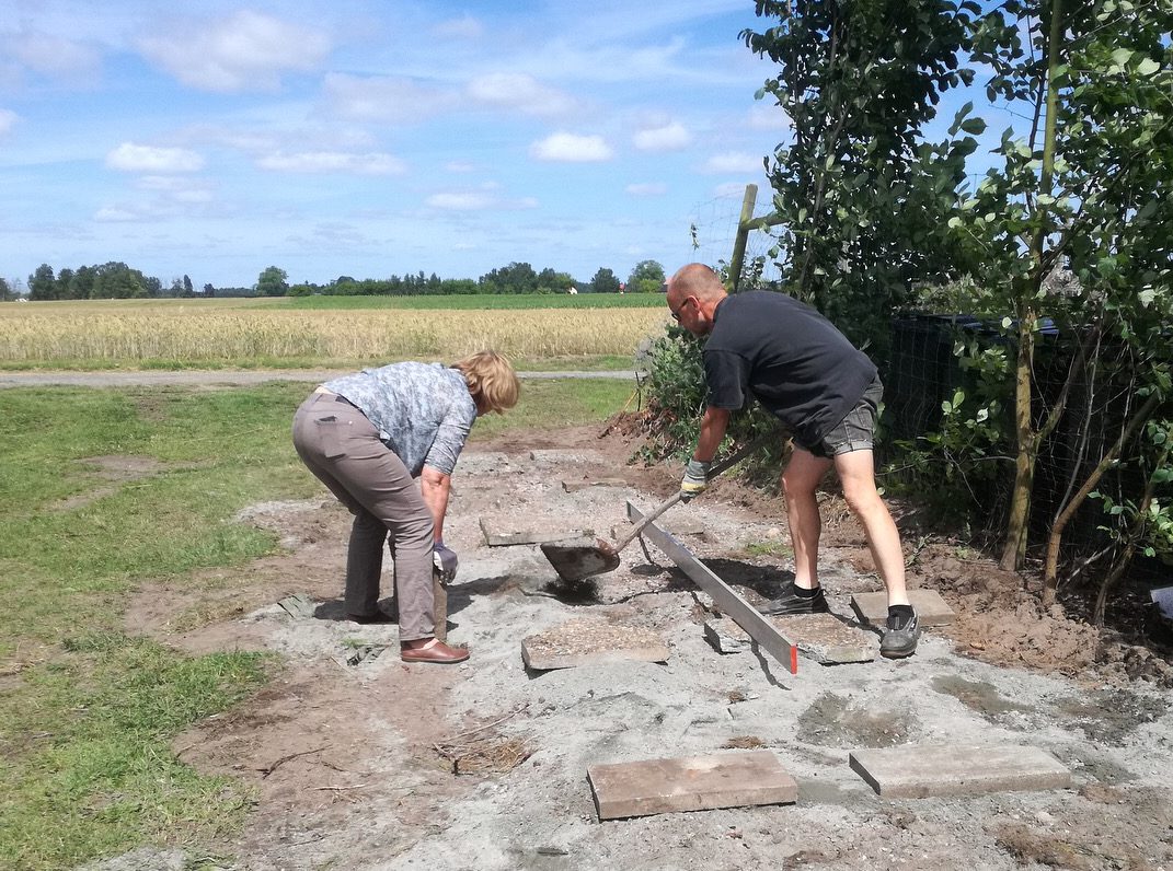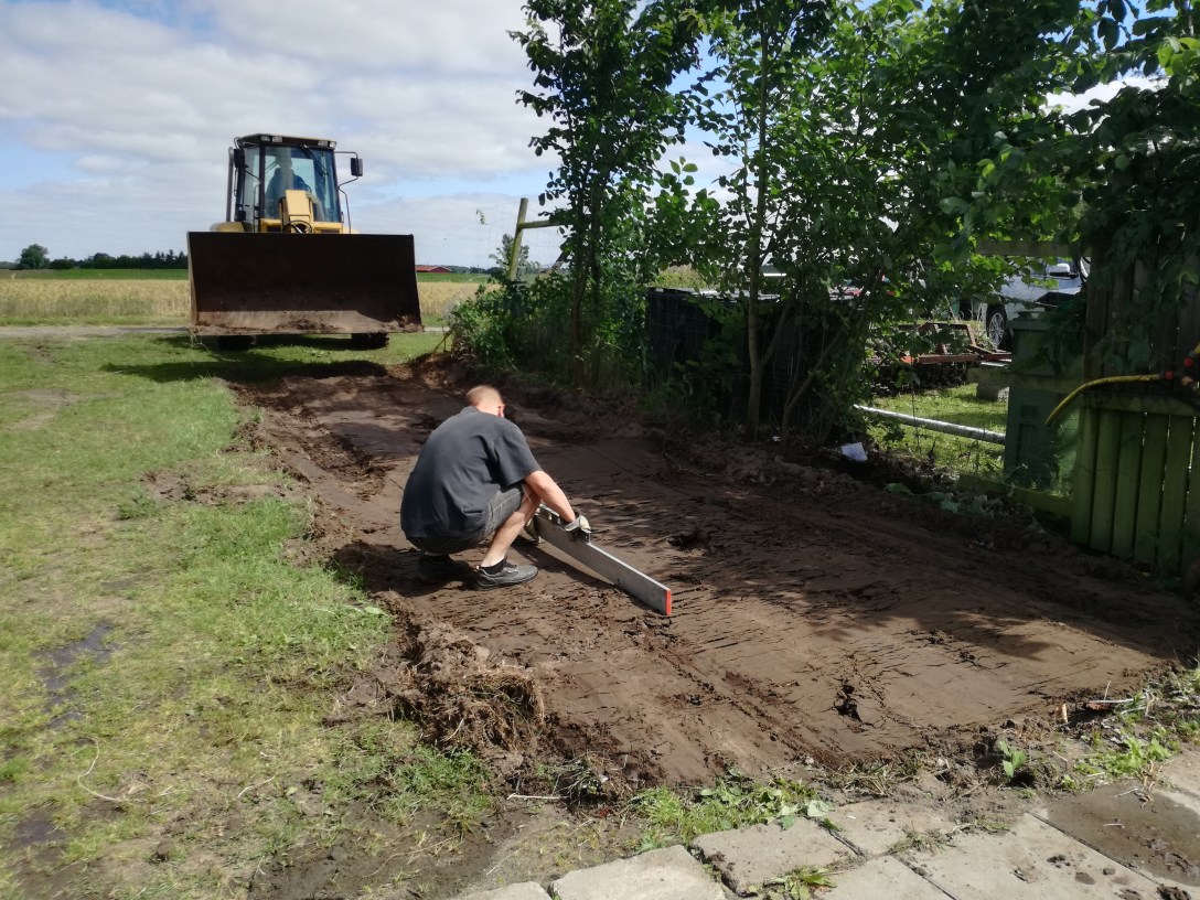 Efter det planade vi ut marken, la ut grus och plattor och vägde av så att den nya arbetsboden skulle stå rakt och fint.